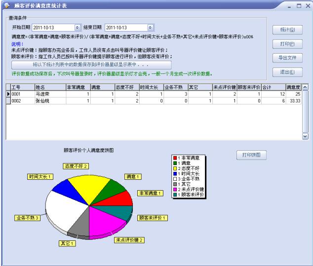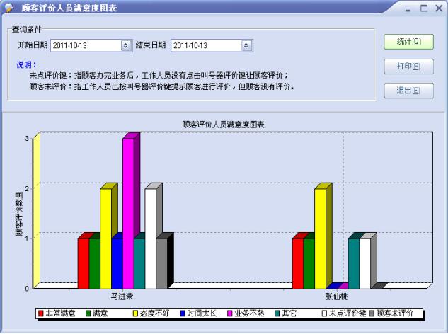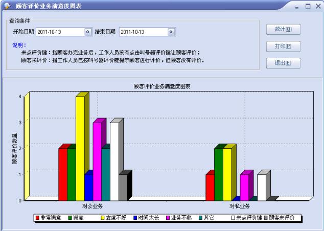 所有统计均可根据时间范围查询,每年、每季度、每月或每日窗口人员满意度的各种情况,可清楚的看出窗口人员的各方面的状况,可轻松的生成图表,并可从图表上或数据中表现出来,并提供输出打印功能。